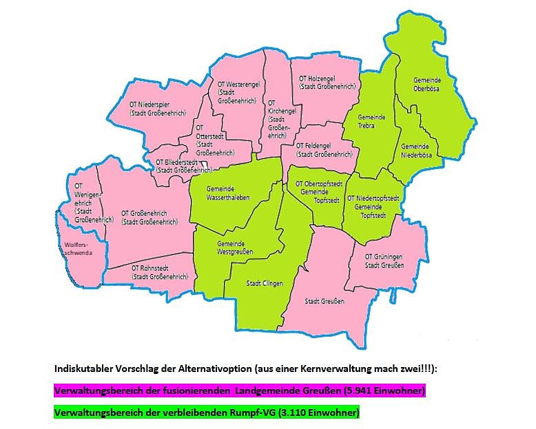 Für die sieben fusionsunwilligen Kommunen problemlos ein tragfähiger Kompromiss. Aber prompt folgte ein Alternativvorschlag als Neugliederungsoption, welcher inhaltlich einzig auf der Stellungnahme von Greußen und Großenehrich im Rahmen der ersten Anhörung basiert und wohl die denkbar schlechteste Lösung überhaupt wäre. Hierzu sei noch beiläufig die Bemerkung erlaubt, dass niemand wirklich wissen will ob und wie diesbezüglich hinter den Kulissen über Parteifreunde Einfluss genommen wurde. Dieser beinhaltet die Spaltung der gegenwärtigen Verwaltungsstruktur für insgesamt 8.915 Einwohner mit einer Kernverwaltung in zwei Kernverwaltungen, die der Rest-VG (3.110 Einwohner) sowie die der fusionierenden Landgemeinde Greußen (5.941 Einwohner).