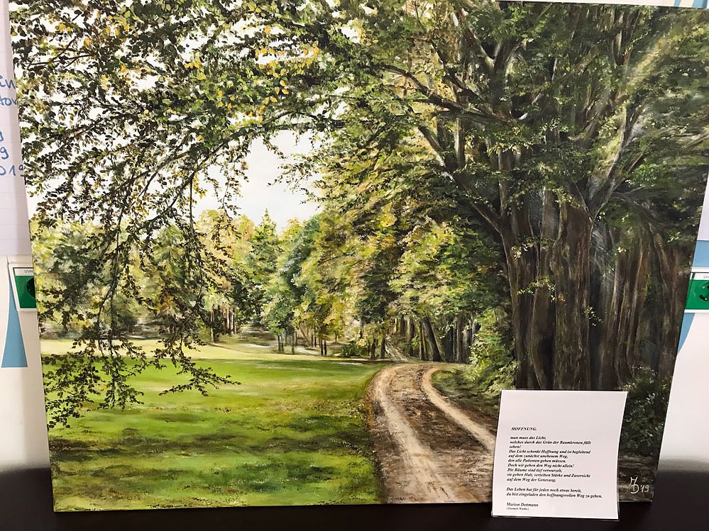 überreichen, das einen von Bäumen gesäumten Weg zeigt, auf den durch die Baumkronen warmes Sonnenlicht durchscheint. Zu dem Bild hat sie einen Hoffnung vermittelnden Text verfasst, der sich an zukünftige Patientinnen in Sömmerda richtet und der zusammen mit dem Bild aufgehängt werden wird