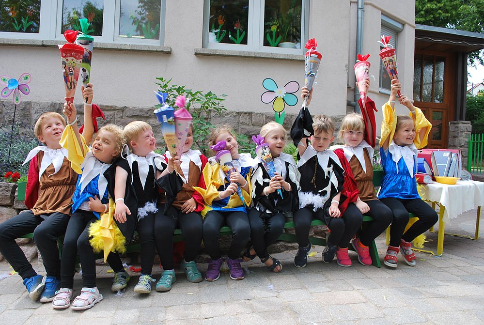 Zum Zuckertütenfest stellten sie mit Liedern und Tänzen ihre eigene Entwicklung dar und spielten mit tollen Kostümen sowie sehr emotional die Geschichte der Vogelhochzeit nach – jeder nach seinen individuellen Möglichkeiten.