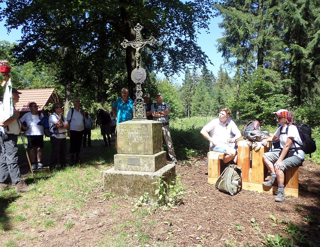 Ein kurzes Verweilen am schwarzen Kreuz, eine weitere Trinkpause kommt uns allen sehr gelegen, derweil uns Willi Glunz die gruselige Geschichte zum schwarzen Kreuz erzählt eine Mörderbande im 30jährigen Krieg raubte einen Köhler aus, ermordete ihn und spießte ihn auf Holzscheite in Kreuzform auf und stellte ihn auf den rauchenden Meiler, wo er am nächsten Tag als schwarzes Kreuz gefunden wurde. Wir wandern weiter und haben bald den Sattel des Rehberges 427m erreicht, unter dem im Tunnel die Eisenbahn nach Altenbeken rollt. Die Driburger Hütte am Waldrand stehend, ist unser Tagesziel. Hier werden wir von Renate Mügge vom Heimatverein Bad Driburg aufs herzlichste begrüßt und vom Team der Hütte bestens mit Kaffee und Kuchen mit leckerer Schlagsahne versorgt.