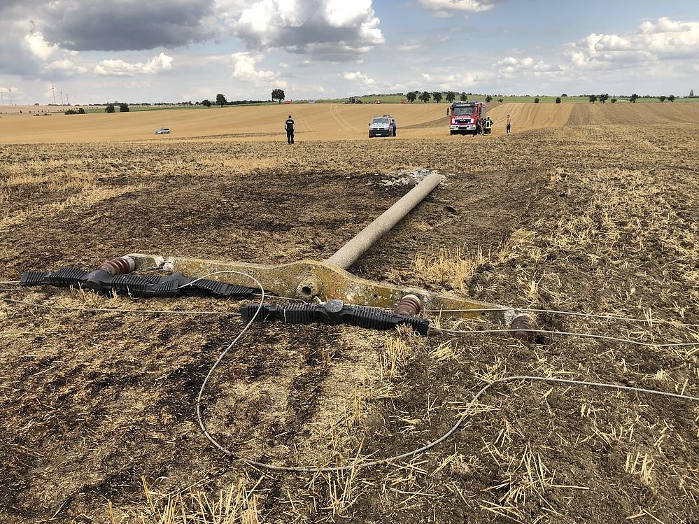Einsatz der Feuerwehr und Polizei am Donnerstagnachmittag zwischen Otterstedt und Wasserthaleben bei einem Feldbrand. Der Fahrer eines Traktors stieß kurz nach halb drei während der Feldarbeit gegen einen Strommast und riss diesen um. Durch die herabstürzende Stromleitung entzündete sich das Feuer und zwei weitere Masten wurden beschädigt. Die Flammen waren schnell gelöscht, Verletzte gab es nicht.