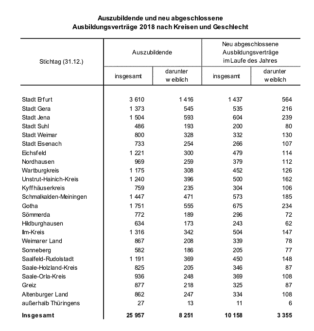 Im Jahr 2018 begannen 10 158 Personen in Thüringen eine Ausbildung im Rahmen des dualen Sys- tems. Damit blieben nach Mitteilung des Thüringer Landesamtes für Statistik die neu abgeschlossenen Ausbildungsverträge gegenüber dem Jahr zuvor nahezu unverändert.
