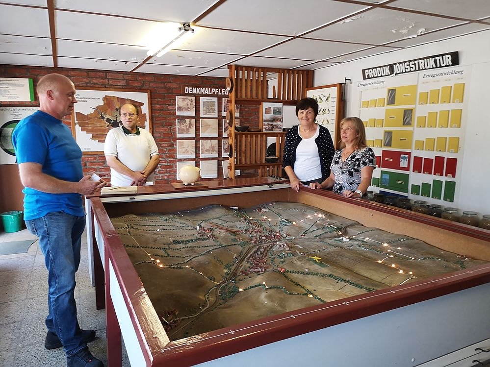 Im Agrarkabinett zeigen Geschäftsführer Uwe Schlufter (links) und Prokuristin Anita Köhler (2.v.r.) der Abgeordneten Iris Martin-Gehl und ihrem Begleiter Egon Haupt (2.v.l.) ein Flächenmodell zur Entwicklung ihres Unternehmens.