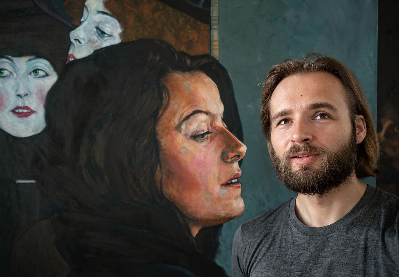 Wulf Rechtacek vor den Wienerinnen, einer der ausgestellten Arbeiten.