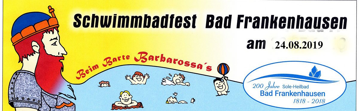 Autor: khhAm 24.08. ist es wieder soweit, das 11. Frankenhäuser Schwimmbadfest oder auch das 3. Solewasser- Vitalpark- Schwimmfest der Neuzeit hält wieder altbewährte und neu entwickelte Badespaßaktionen bereit, um die kleinen und großen, jungen und alten Wasserratten zu begeistern und zum Mitmachen zu animieren.