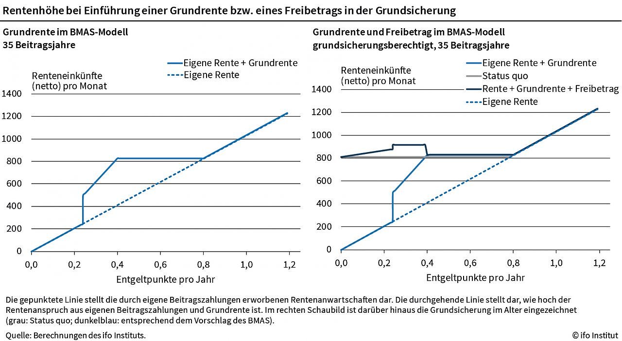Rentner, die wegen niedriger Alterseinkünfte auf die Grundsicherung im Alter angewiesen seien, profitierten hiervon allenfalls in geringem Umfang, erläutert Ragnitz. Denn auch die aufgestockte Rente übersteige in vielen Fällen nicht die vom Sozialamt festgelegte Grundsicherung im Alter von 808 Euro im Monat. Zudem entstehe ein Anspruch auf die Grundsicherung erst nach 35 Grundrentenjahren. Das schließe einen Großteil Bedürftiger aus. Zeiten von Arbeitslosigkeit oder Beschäftigung in einem Minijob begründeten nach den vorliegenden Plänen überdies überhaupt keinen Anspruch auf Grundrente. Die geplante Reform ist eine Abkehr vom Versicherungsprinzip hin zu einer Umverteilungspolitik, sagt Ragnitz.