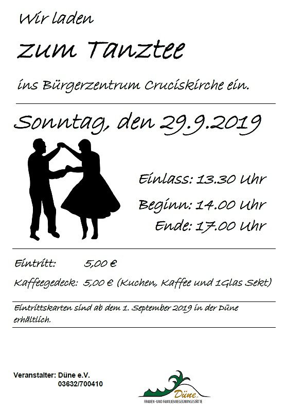 Nächste Woche Sonntagnachmittag ein wenig die Füße vertreten? Das geht besonders gut beim Tanztee. Dazu diese Meldung der Düne, mit dem Tipp zum Vorverkauf...