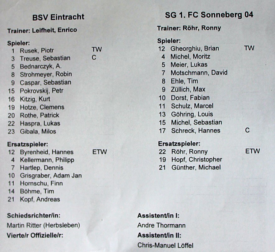 BSV Eintracht Sondershausen hatte die SG 1. FC Sonneberg 04, die erst in die Landesklasse aufgestiegen waren. Beide Mannschaften lagen vor dem Spiel dicht nebeneinander. Und so spielte man: