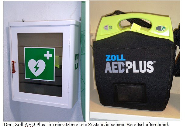 Der Zoll AED Plus im einsatzbereitem Zustand in seinem Bereitschaftsschrank