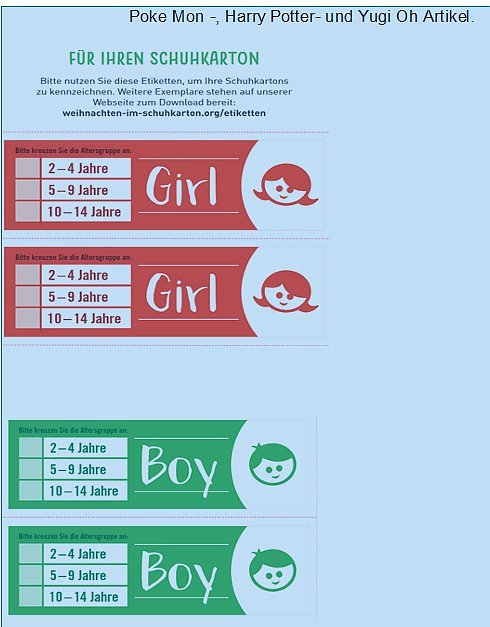Lt. Einfuhrbestimmungen in den Empfängerländern, dürfen nur neuwertige Geschenke in den Schuhkarton gepackt werden (keine gebrauchten Plüschtüre, Kleidungsstücke, Spiele o.ä).