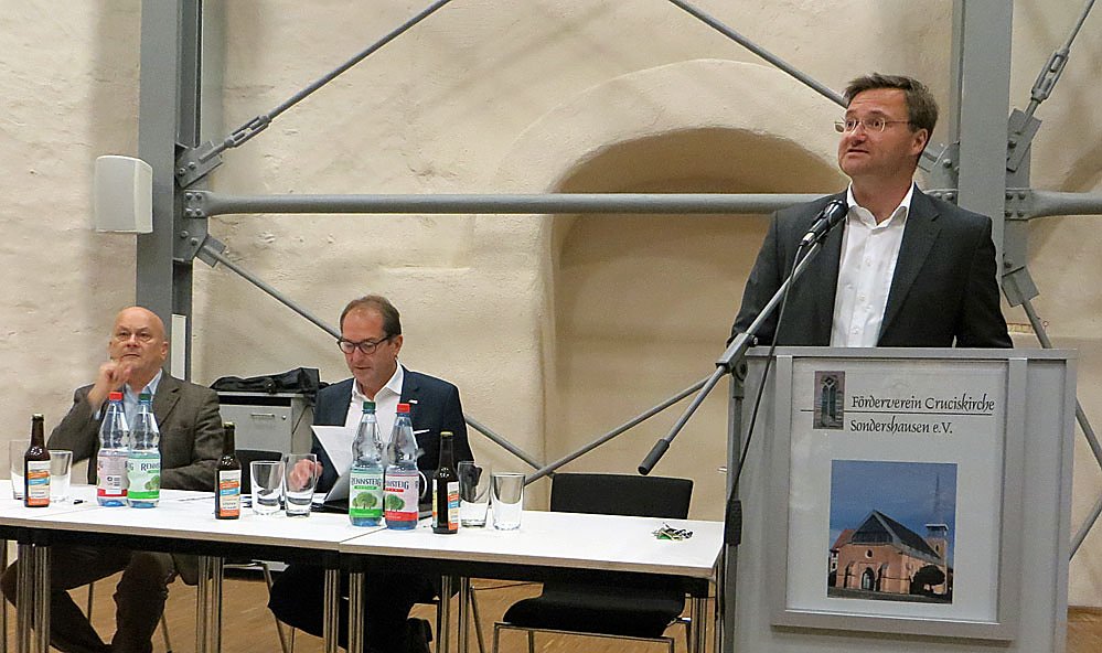 Zu Beginn der Veranstaltung bat Schard die Gäste, ca. 70 Interessierte waren gekommen und sorgten für ein gut gefülltes Bürgerzentrum, um eine Schweigeminute für die Opfer des Anschlags in Halle am gleichen Tag. Unter den Gästen befanden sich auch Manfred Grund, Mitglied des Bundestages sowie Manfred Scherer als hiesiger Landtagsabgeordneter, der zum Ablauf der Legislatur den Landtag verlässt und nicht wieder zur Wahl antritt.