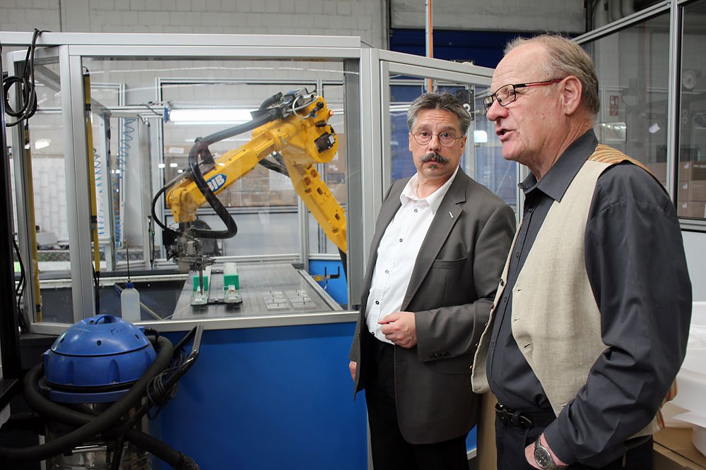Wolfgang Wytrieckus, hier mit Sonlux-Werkleiter Steffen Schöllhorn, informierte sich über einen anderen Roboter in der der Leuchtenfertigung.