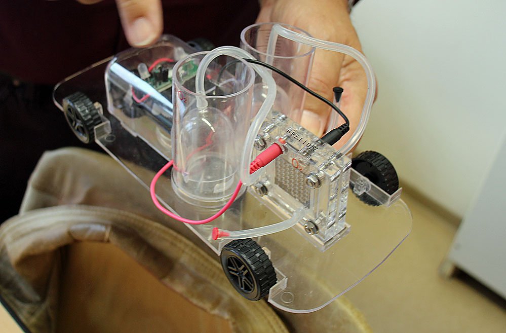 Und mit diesem tollen Gerät, wird nicht nur gezeigt, wie Wasser in seine Bestandteil Wasserstoff und Sauerstoff zersetzt wird, sondern auch, wie man mit Hilfe einer Brennstoffzelle aus beiden Bestandteilen wieder Strom erzeugt.