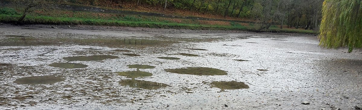 Offensichtlich sorgt die lange Trockenheit (trotz der wenigen Niederschläge) dafür, dass der Zufluss nicht gerade berauschend ist. Da wird es wohl eine Zeit dauern, bis der kleine Parkteich wieder befüllt ist.