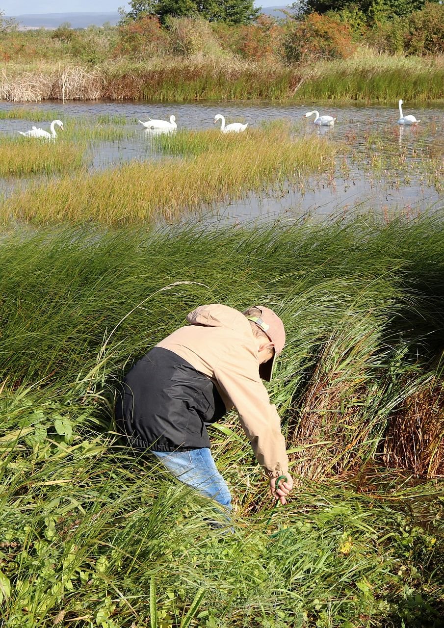 Höhepunkt der Exkursionen war jeweils die Untersuchung der Wasserqualität in einem Gewässer auf dem Gelände der Auleber Fischzucht. Mit Keschern durften die Kinder am Rand eines Teiches Proben entnehmen, die gefangenen Tiere in Becherlupen beobachten und mit Hilfe von Bestimmungshilfen versuchen, die Arten zu erkennen. Claudia Wicht und Silke Schulze vom Landschaftspflegeverband Südharz/Kyffhäuser unterstützen und berieten sie dabei. Der Verband ist Träger des Hotspot-Projektes Gipskarst Südharz – Artenvielfalt erhalten und erleben.