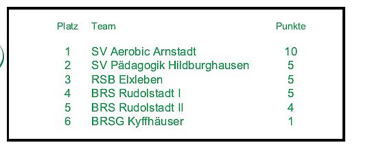 Die Titelverteidigerinnen von RSB Elxleben (Platz 6 bei der DM) und die Vizemeisterinnen von SV Aerobic Arnstadt (Platz 4 bei der DM) sind auch in dieser Saison wieder die Favoritinnen auf den Titel. Spannend dürfte auch der Kampf um den dritten Platz sein, denn dieser berechtigt zur Teilnahme an der Deutschen Meisterschaft im nächsten Jahr im niedersächsischen Bückeburg.