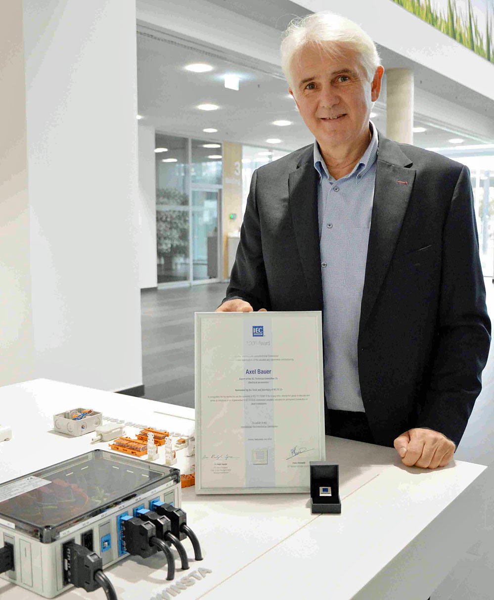 So betrifft die aktuelle Auszeichnung zum Beispiel die WAGO Installationssteckverbinder WINSTA®. Die Auszeichnung des Gremiums IEC TC 23 habe ich als Projektleiter für die Entwicklung der Norm IEC 61535 für steckbare Installationen erhalten. Die Idee, die Verdrahtung in der festen Installation in Gebäuden steckbar zu gestalten, startete als Normungsprojekt bereits 1992, in 1995 wurde ein schriftlicher Vorschlag international erstmals eingebracht und diskutiert. Erst in 2009 erschien dann endlich, nach schier endlosen Debatten und Abstimmungen, die 1. Edition. Danach haben wir umgehend an der neuen Edition 2 gearbeitet, erklärt Axel Bauer. Ein langer Weg, der im Normungsumfeld allerdings Normalität ist. Als Projektleiter und Convenor in der Normung braucht man langen Atem, Beharrlichkeit und Überzeugungskraft, um eine Norm zu erarbeiten und zu verabschieden, weiß Axel Bauer.