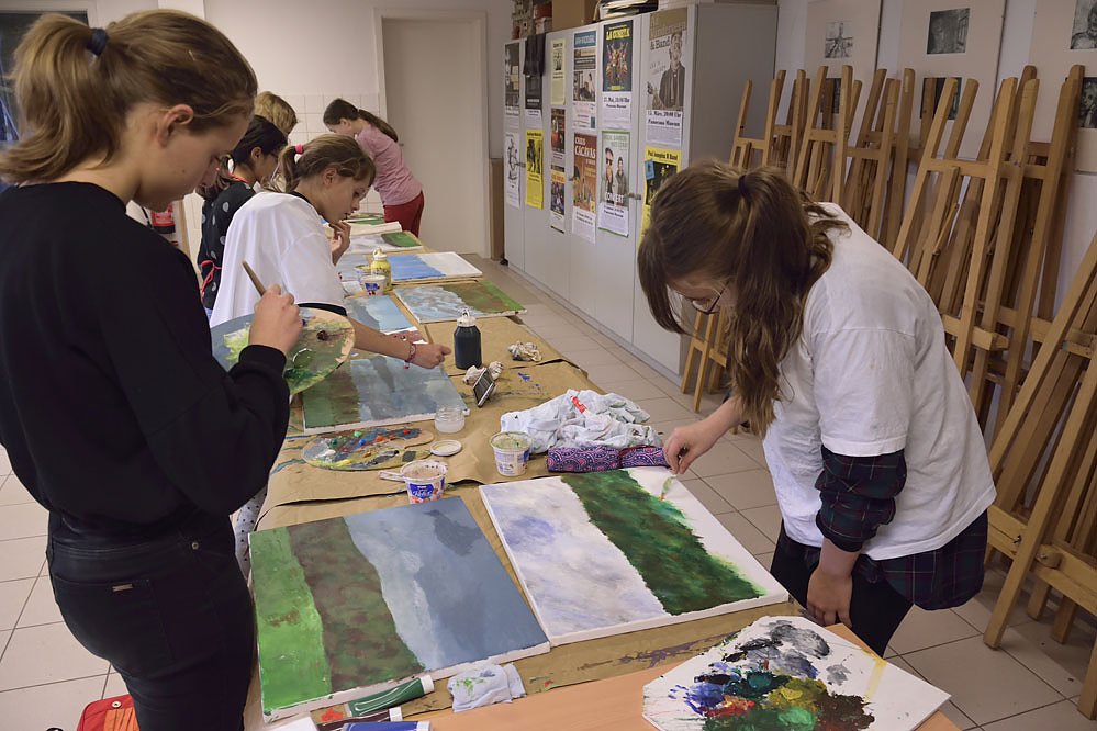 Smila, Silva und Ronja beim Nacharbeiten ihrer Landschaftsbilder);