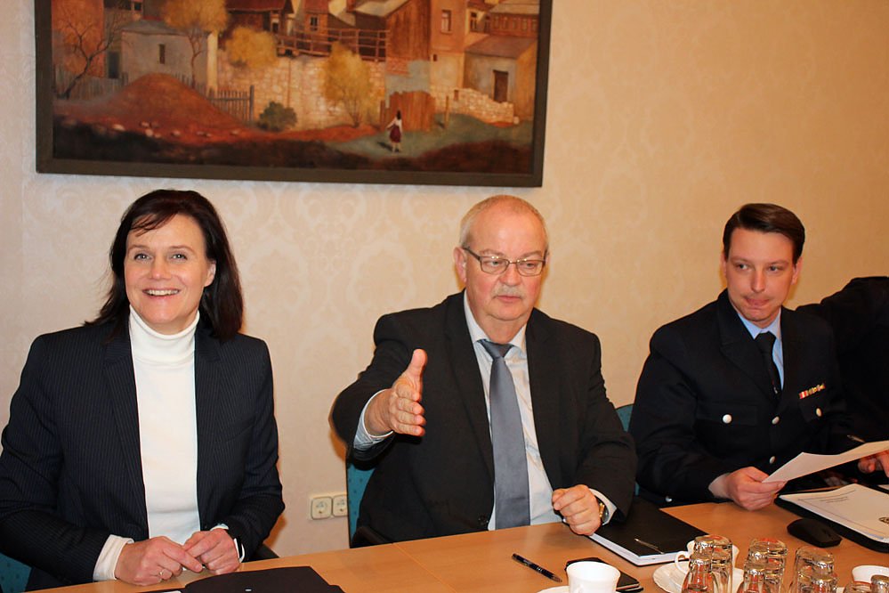 Landrätin Antje Hochwind-Schneider, Verwaltungsleiter Dr. Heinz-Ulrich Thiele und Kreisbrandinspektor Jonas Weller bei der Beratung. Hochwind-Schneider und Weller übergaben anscließend Urkunden und Blumen.