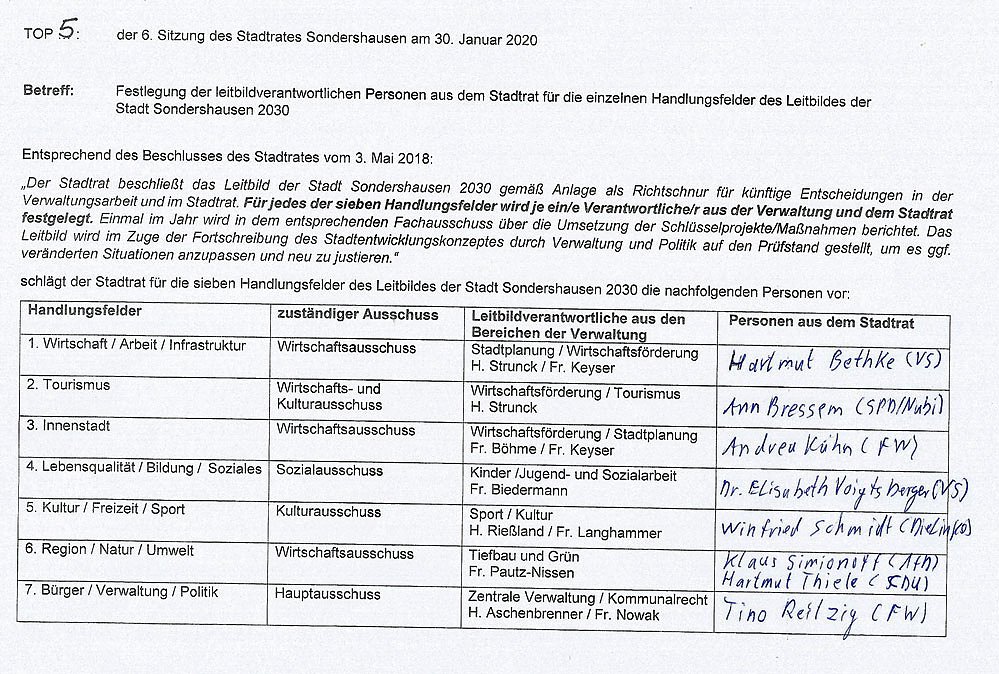Festlegung der leitbildverantwortlichen Personen aus dem Stadtrat für die einzelnen Handlungsfelder des Leitbildes der Stadt Sondershausen 2030
