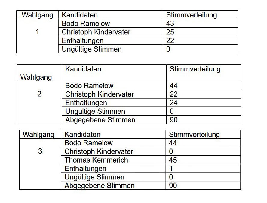 Im zweiten Wahlgang erhielt Bodo Ramelow 44 Stimmen, für Christoph Kindervater gab es 22 Stimmen bei dieses Mal 24 Enthaltungen.