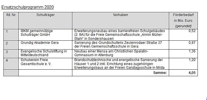 Daneben werden im laufenden Jahr im Ersatzschulprogramm weitere 4,05 Millionen Euro für vier Schulbauvorhaben freier Schulträger bereitgestellt.