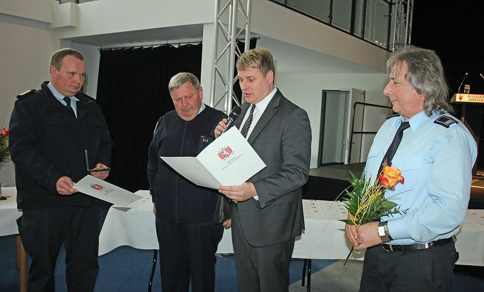 Für 50 Jahre treue Dienste in der Feuerwehr erhielt Jürgen Grabe das Ehrenabzeichen in Gold. Die rund 90 Namen für weitere Auszeichnungen, Ernennungen und Beförderungen, kann kn allerdings nicht alle nennen, aber in der Bildergalerie gibt es die Fotos der anwesenden Kameradinnen und Kameraden. Die Auszeichnungen nahmen Bürgermeister Strejc, Stadtbrandmeister Fischer und der Stellvertreter der Kreisbrandmeister Ronald Wicke vor.