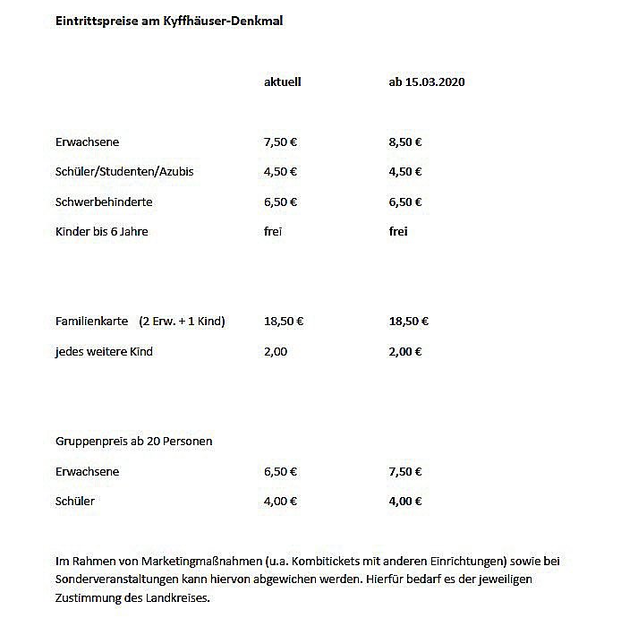 Der Kreisausschuss beschloss zum 15. März 2020 die Änderung der Eintrittspreise am Kyffhäuser-Denkmal entsprechend des Vorschlags laut Anlage 1.