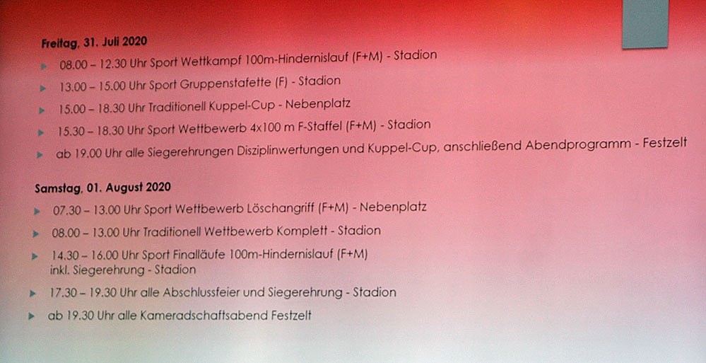 In jedem Fall dürfen sich die Zuschauer auf spannende und interessante Wettkämpfe freuen, denn es geht für die Mannschaften auch um die Qualifikation zur Internationalen Feuerwehrolympiade im Jahre 2021.
