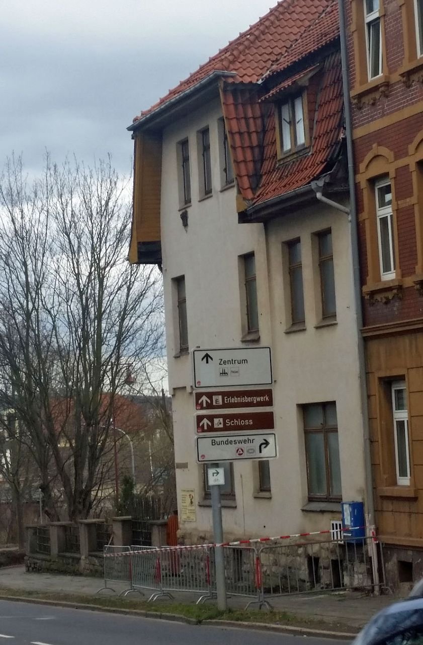 Nach dem Einsatz der Feuerwehr wurde der Fußweg vor dem Haus in der August-Bebelstr. (gleich neben dem Finanzamt bergaufwärts) mit Absperrgittern als Gefahrenbereich abgesperrt.