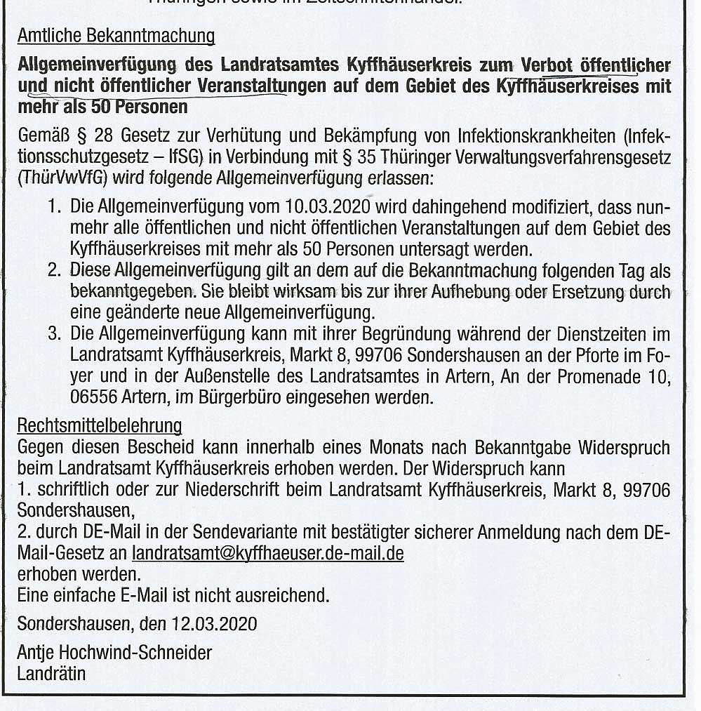 Eine der ersten Maßnahmen war eine Allgemeinverfügung, welche die Personenzahl bei Veranstaltungen auf unter 500 Personen begrenzte. In einer weiteren Allgemeinverfügung wurde jetzt die Begrenzung auf 50 Personen festgelegt, siehe auch den den Bericht vorab von kn: