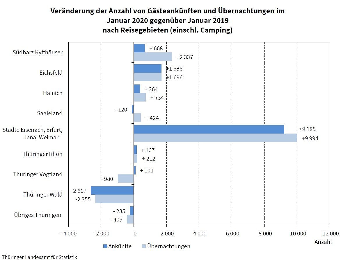 Eine sehr gute Bilanz hatte das Reisegebiet Eichsfeld. Hier wurden 23,3 Prozent mehr Ankünfte und 7,5 Prozent mehr Übernachtungen als im Januar 2019 registriert. Ein sehr deutliches Wachstum war auch im Reisegebiet der Städte (Eisenach, Erfurt, Jena