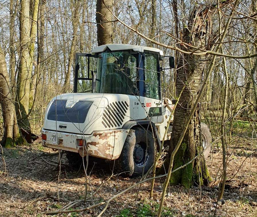 Unter einer Plane versteckt stand hier ein Radlader. Wie dieser in das Waldstück kam ist derzeit noch unklar.