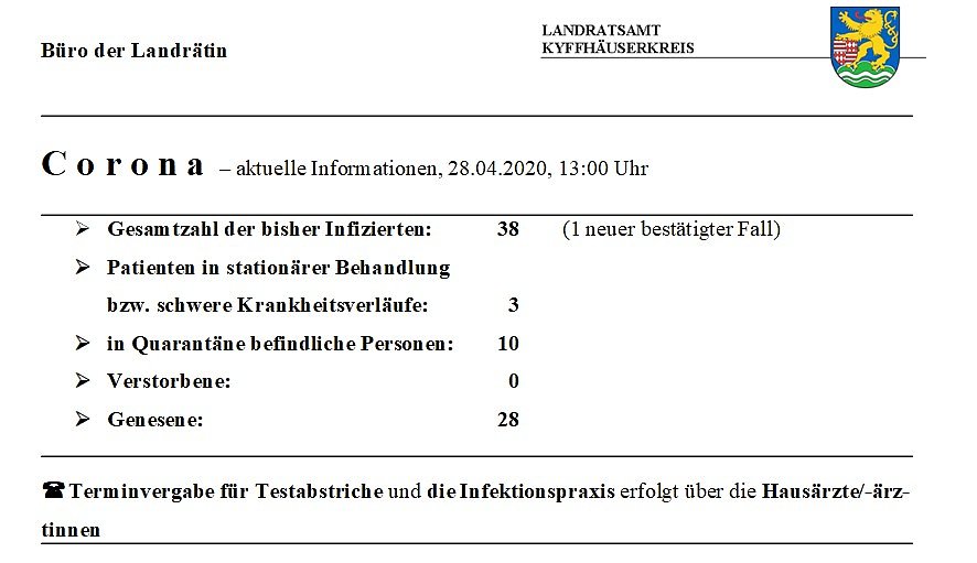 Corona - ein neuer Fall und Schrittweise Öffnung von kulturellen Einrichtungen (Foto: Landratsamt Kyffhäuserkreis)