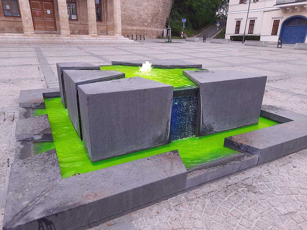 Am heutigen Mittwoch war das Wasser am Springbrunnen auf dem Markt mit einer wohl fluoreszierende Farbe versetzt worden, zumindest zeigte sich das Wasser im Brunnen gelb-grün.
