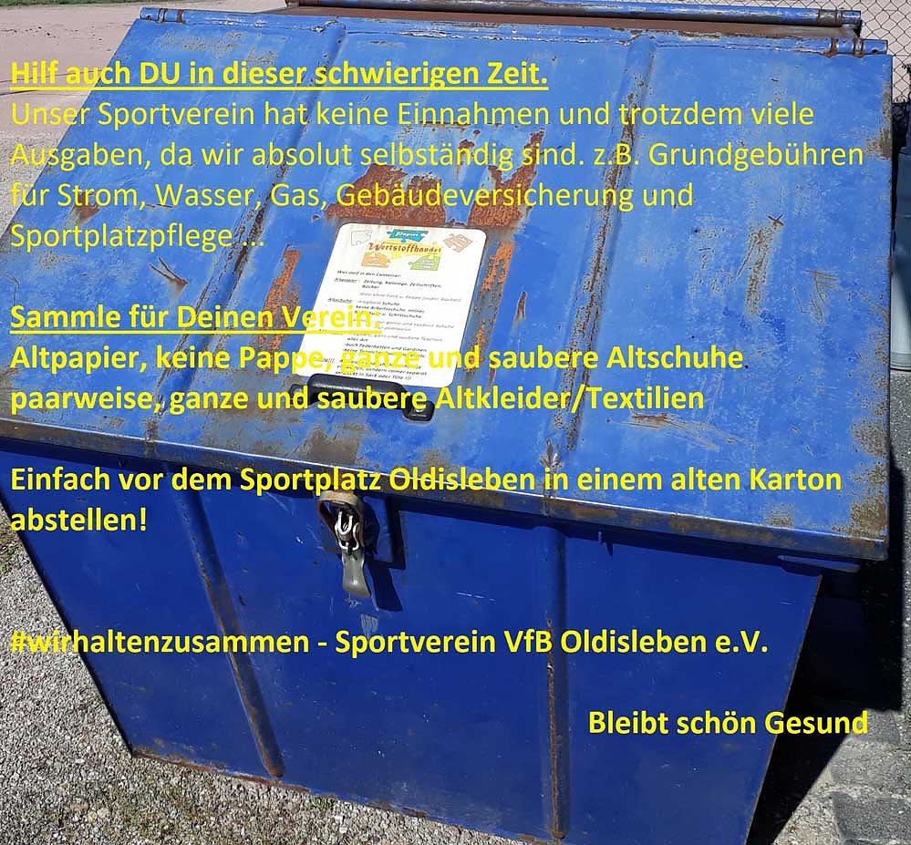 Eine Aktion der Jugendabteilung ist die Sammlung von Altpapier. Auf dem Sportgelände steht ein Container bereit. Das Altpapier, keine Pappe, und saubere Altschuhe paarweise, ganze und saubere Altkleider/Textilien einfach vor dem Sportplatz Oldisleben in einem alten Karton abstellen.