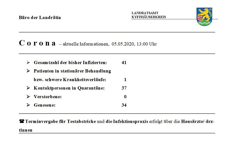 Hier die tägliche Meldung aus dem Landratsamt Kyffhäuserkreis verbunden mit aktuellen Zahlen im Rahmen der Corona-Pandemie und der zugehörigen Testdurchführungen...