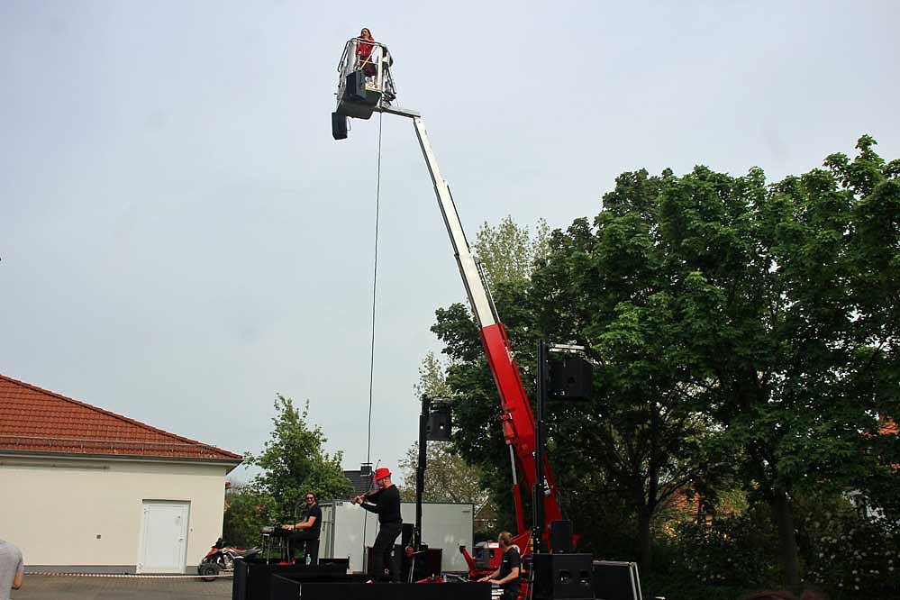 Das erste Hebebühnenkonzert im Borntal war voller Erfolg und heute fand am Vortag des der zweite Streich statt. Dieses Mal wurde auf dem TEGUT-Parkplatz im Wohngebiet Franzberg musiziert. Die Band ANNRED, das Trio um die Lady in Red Anna Steinhardt zusammen mit Vinzenz Heinze und Fabian Fromm begeisterten bei prima Wetter das Publikum. Nur Anna Steinhardt hatte manchmal bei einer kleinen Windboe "Probleme" mit ihrem Kleid, aber sie war ja hoch genug.