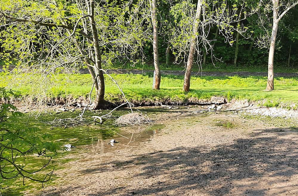 In den letzten Tagen hatte kn bereits berichtet, dass der kleine Parkteich keinen Zufluß aus dem Mühlgraben hat und dadurch leer lief.
