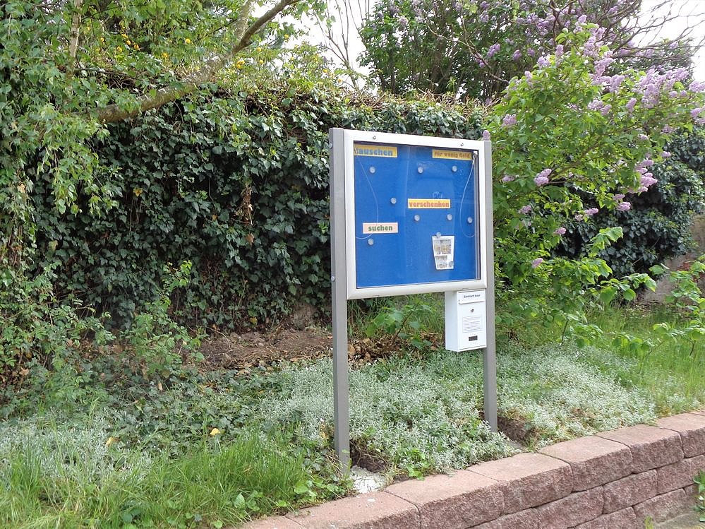 Autor: khhAus einem liebevoll restaurierten Sichtkasten, der für eine Wandaufhängung vorgesehen war wurde ein, zwischen Stahlstangen gesetzter Eyecatcher gemacht, der es nun ermöglicht, dass viele Sachen, die achtlos in den Grobmüll wandern, verbrannt werden oder in einer Scheune vor sich hin stauben, vielleicht für wenig Geld oder als Tauschobjekt oder sogar verschenkt einen neuen Besitzer findet, der es wieder wertschätzt. Auch wenn jemand etwas sucht, noch die zwei Pflastersteine, die ihm für die Terrasse fehlen, einen halben Sack Betonestrich oder sich mal eine Rüttelplatte ausborgen möchte, kann in der Lindenstraße seinen Zettel aushängen.