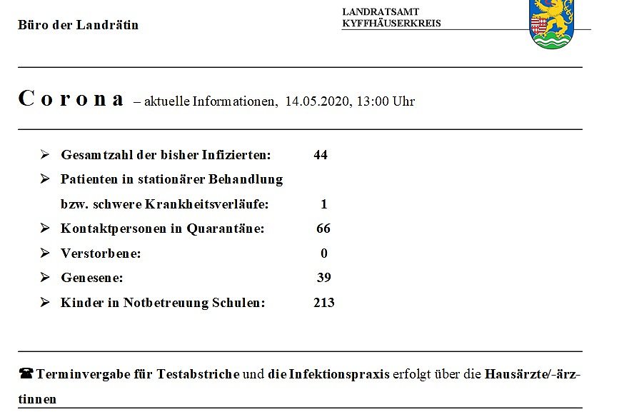 Hier die tägliche Meldung aus dem Landratsamt Kyffhäuserkreis verbunden mit einer Information aus dem Landratsamt zum Thema derzeitiger Stand des Schulbetriebes...