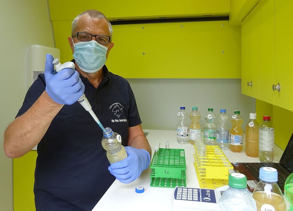 Wasserproben können von 9 bis 11 Uhr am Labormobil abgegeben werden. Dipl. Ing. Peter Brückner, Rentner im Bundesfreiwilligendienst hilft Dipl.-Phys. Harald Gülzow am Informationsstand, damit die Bürger bei der Abgabe ihrer Wasserprobe nicht lange warten müssen. Im Vorfeld wurde ein Hygiene- und Abstandsplan erstellt, damit alle sicher ihre Wasserprobe abgeben und trotz Corona ausführlich beraten werden können. Eine Grunduntersuchung auf den Nitrat-, Säure- und Salzgehalt wird gegen eine geringe Kostenbeteiligung von zwölf Euro durchgeführt. Diese Untersuchung wird bereits vor Or durchgeführt, so dass die Bürger ihre Ergebnisse schon gegen Ende der Aktion abholen können.