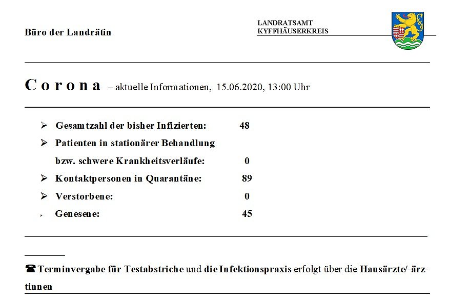 Hier die tägliche Meldung zu Corona aus dem Landratsamt Kyffhäuserkreis und die ab heute gültigen Regelungen in Schulen / Kindertagesstätten / Sportbetrieb...