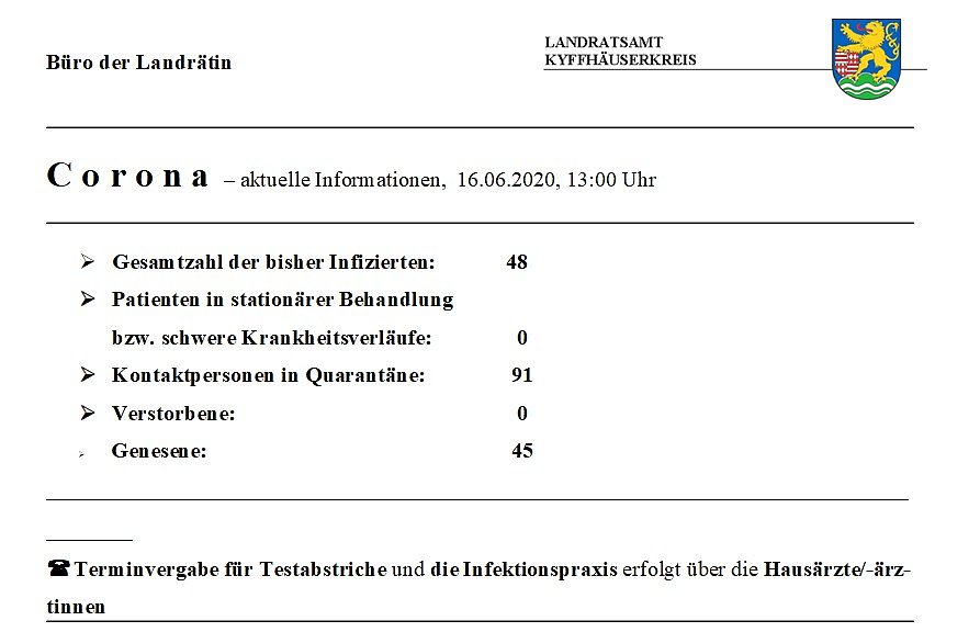 Hier die tägliche Meldung zu Corona aus dem Landratsamt Kyffhäuserkreis und die Hiweise zur Umsetzung der Anzeigepflicht im Landratsamt Kyffhäuserkreis bei Veranstaltungen...