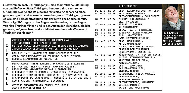 Der Theaterkünstler Steve Karier schwimmt durch Thüringens Städte und Dörfer. Während 17 Aufführungen besucht er 17 Orte in 17 Tagen – jeden Abend anders präsentiert der gebürtige Luxemburger seinem Publikum eine theatralische Erkundung und Betrachtung über Thüringen. Thema ist weniger die Thüringer Kulturhistorie, sondern der unerwartete, subjektive Blick auf Geschichte(n) von Ur- Thüringer*innen und solchen, die zugezogen sind. Steve Karier, als ganz und gar unbelasteter Luxemburger, stellt Ihre Erzählung(en) in den Mittelpunkt des Abends.