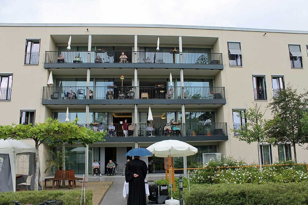 Die Bewohner*innen versammelten sich auf dem Balkon und öffneten ihre Fenster. Leider spielte an diesem Nachmittag das Wetter nicht ganz mit, aber auch dieses Hindernis meisterte Pfarrer Weber souverän.