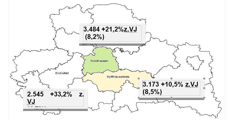 Im Landkreis Nordhausen waren im Juni 3.484 Menschen arbeitslos. Hier blieb die Arbeitslosigkeit zum Vormonat annähernd konstant. Zum Vorjahr betrug die Steigerung rund ein Fünftel. Die Arbeitslosenquote lag im Juni unverändert bei 8,2 Prozent. Im Vorjahresmonat betrug sie noch 6,8 Prozent.