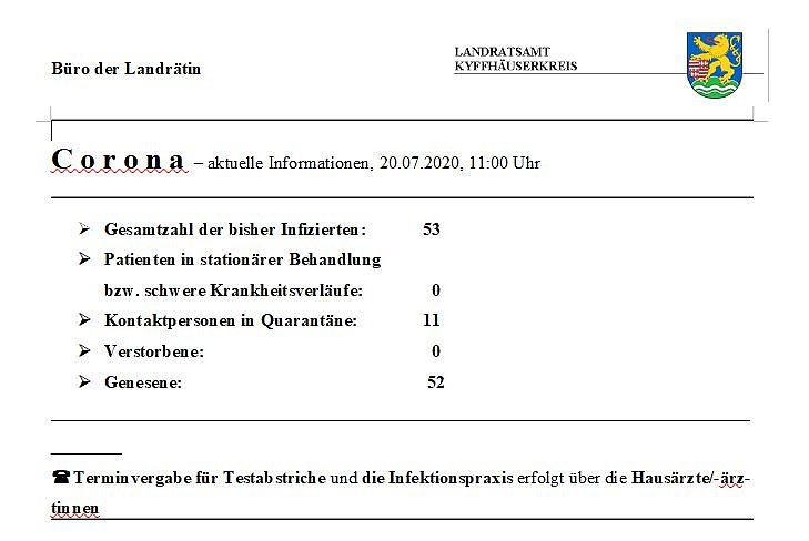 Zum Vortag gibt es keine Veränderungen bei der Zahl der Infizierten. Allerdings gibt es eine neue Anzeigefrist bei nicht öffentlichen, privaten oder familiären Feiern. Hier die tägliche Meldung zu Corona aus dem Landratsamt Kyffhäuserkreis...