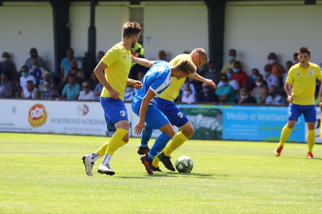 35. Minute: Das Wacker-Bollwerk "Vopel, Franz und Erik Schneider" machen bis jetzt ein starkes Spiel.
