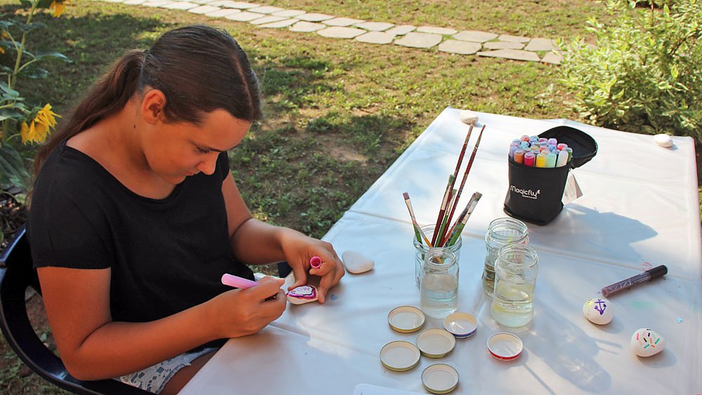 Bei der Feriengestaltung hat man heute die Aktion mal in den Schatten vor der Cruciskirche verlegt. Steine bemalen stand heute auf dem Programm.